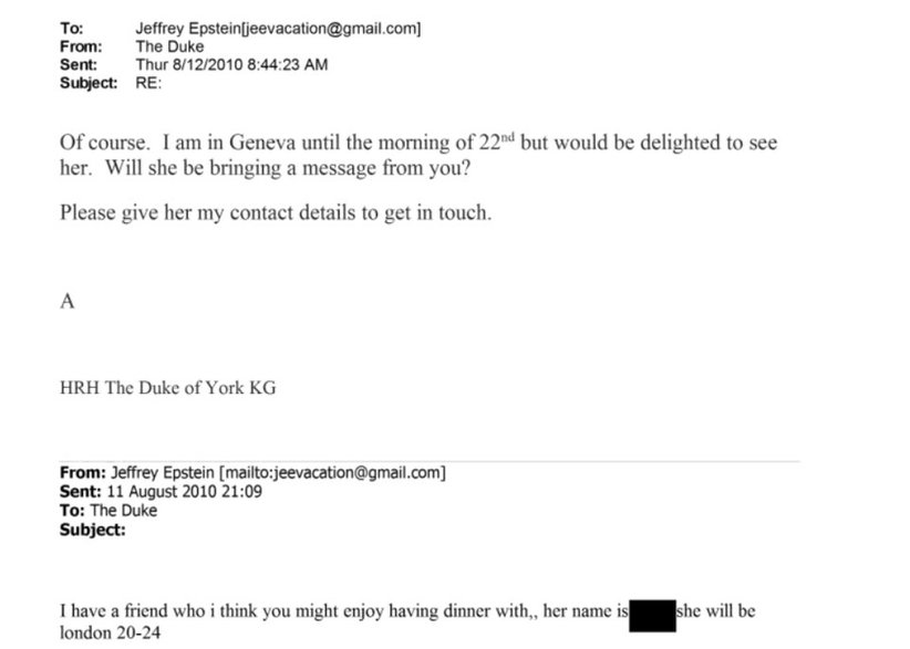 Ponad miesiąc później, w kolejnej wymianie maili, Epstein i Mountbatten-Windsor planują spotkanie w Londynie. Mountbatten-Windsor sugeruje kolację w Pałacu Buckingham, gdzie mieliby "dużo prywatności". Epstein odpisuje, że para będzie "potrzebować prywatnego czasu".