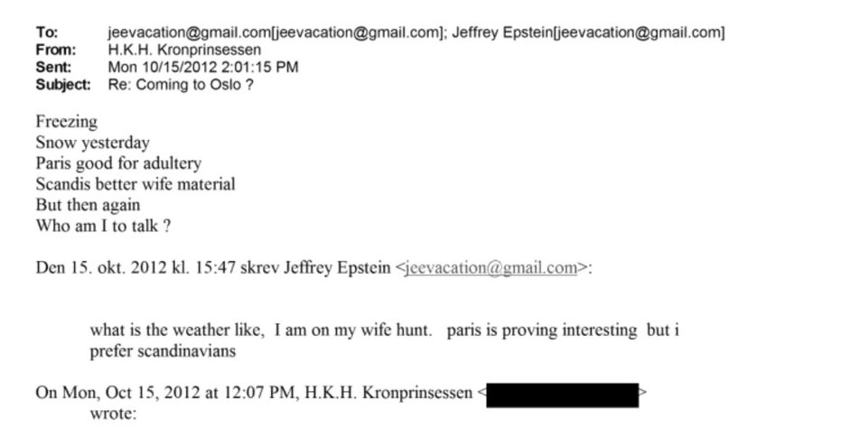 W jednym z maili, wysłanym 15 października 2012 r., Mette-Marit odpowiada Epsteinowi na pytanie o ewentualną wizytę w Oslo. W wiadomości pojawiają się luźne, półżartobliwe uwagi o pogodzie, a także fragmenty o dwuznacznym charakterze: "Paryż dobry na cudzołóstwo. Skandynawki lepsze na żony. Ale z drugiej strony — kim ja jestem, żeby o tym mówić?". Mail jest odpowiedzią na wcześniejszą wiadomość Epsteina, w której pisał, że jest "na polowaniu na żonę", a Paryż jest interesujący, choć preferuje Skandynawki.