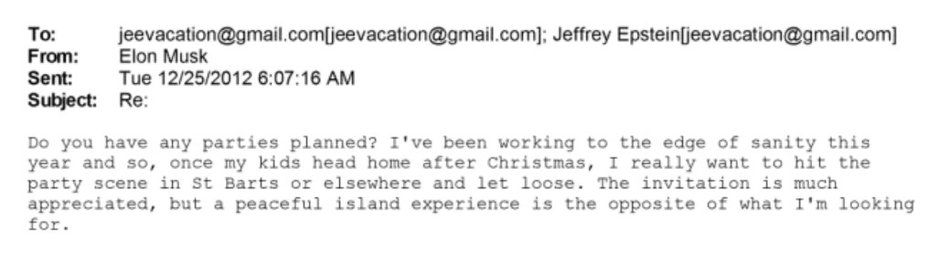 W dokumentach opublikowanych przez Departament Sprawiedliwości są maile między Epsteinem i Elonem Muskiem, w których ten drugi zimą 2012 r. — już po skazaniu Epsteina za wykorzystywanie nieletnich w 2008 r. — pytał o możliwość odwiedzenia go na jego wyspie Little St. James, na amerykańskich Wyspach Dziewiczych.