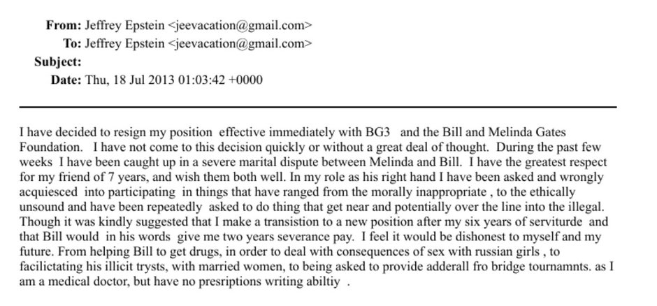 "Podjąłem decyzję o natychmiastowej rezygnacji z mojego stanowiska w BG3 oraz w Fundacji Billa i Melindy Gatesów. Nie była to decyzja pochopna ani podjęta bez głębokiego namysłu. W ciągu ostatnich kilku tygodni zostałem wciągnięty w poważny konflikt małżeński pomiędzy Melindą i Billem. (...)